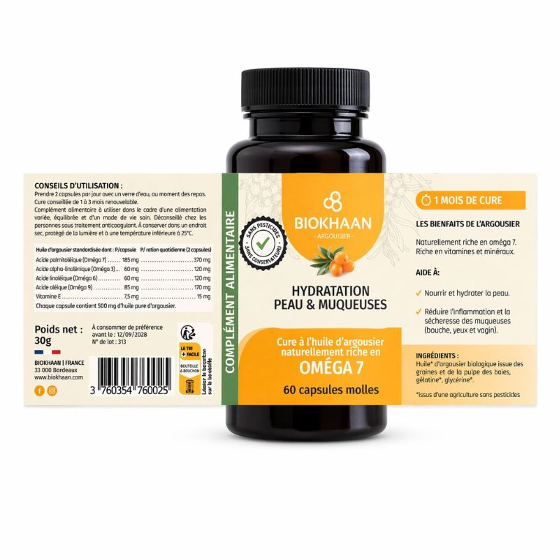 L’huile d’argousier, présente dans notre cure “Hydratation peau & Muqueuses” est naturellement riche en Oméga 7. Notre cure est recommandée pour traiter la sécheresse cutanée et des muqueuses. Elle aide à hydrater en profondeur et permet d’apaiser les zones sensibles.