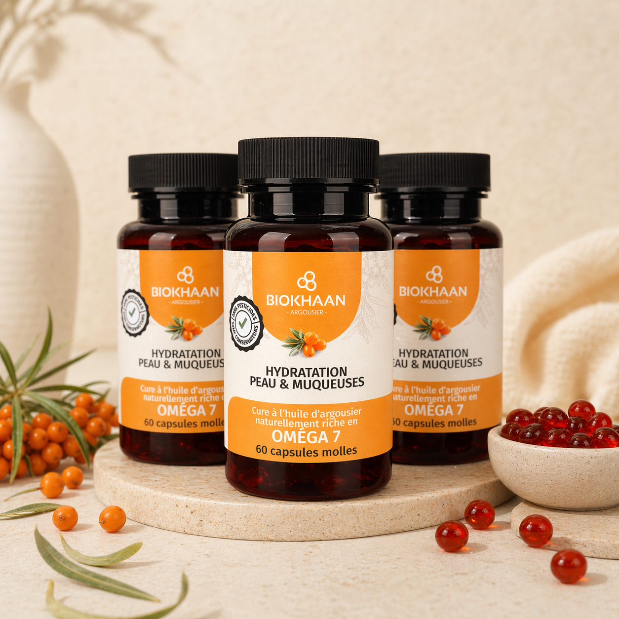 Les oméga 7 sont des acides gras rares, naturellement présents dans l’argousier. Ils jouent un rôle clé dans l’hydratation et la protection des muqueuses (yeux, bouche, zone intime). Avec le temps, leur production diminue, ce qui peut entraîner une sensation de sécheresse et d’inconfort.